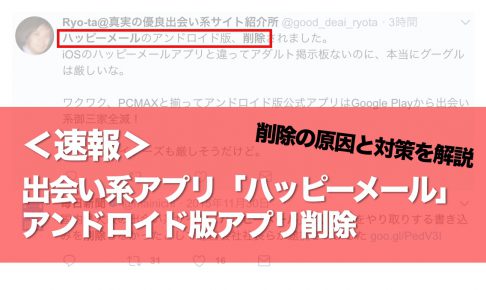 もしかしたらご存知の方も多い『ハッピーメール』という出会いアプリ 多くの方の認識としては、元祖出会い系という認識の方も多いでしょう。この「ハッピーメール」がつい2時間少し前にGoogleplayから削除されアンドロイド版…